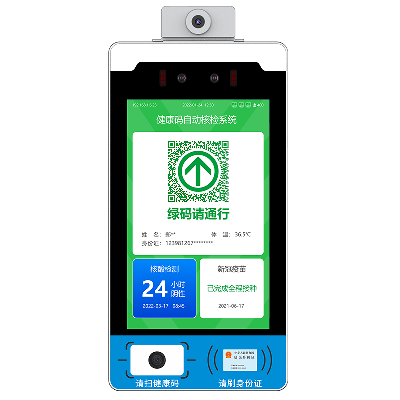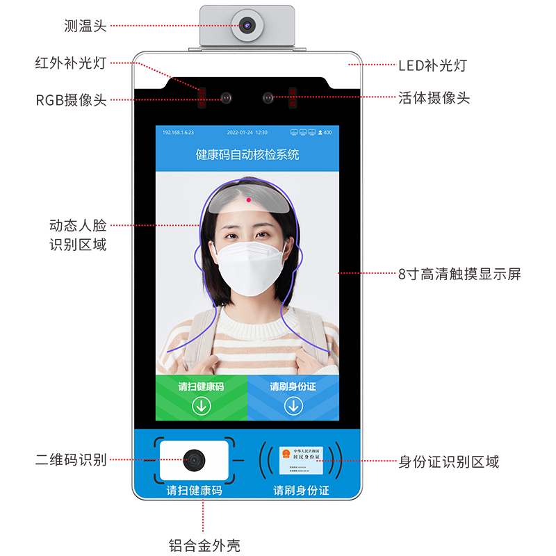 TR608RM-TQS1-A2電子哨兵是一款高性能嵌入式雙目測溫型健康碼核驗終端,終端集成脫機(jī)人臉識別、健康碼核驗、體溫檢測、身份證核驗、現(xiàn)場人臉采集、黑名單預(yù)警、人過留影、活體檢測等功能為一體。采用寬動態(tài)高清人臉識別攝像頭,完全適應(yīng)強(qiáng)光逆光弱光等苛刻環(huán)境,具有識別速度快、準(zhǔn)確率高、名單庫容量大等特點。適用于需要進(jìn)行體溫檢測、健康碼核驗和門禁通行控制的場所。在疫情防控方面,提高通行效率,為疫情管控提供有力的保障。